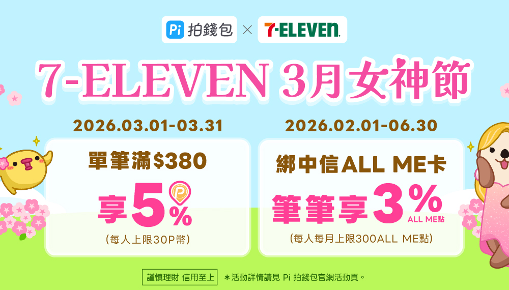 活動期間內,持 Pi 拍錢包至7-ELEVEN單筆實付滿380元享5%P幣回饋(每人最高上限30P幣)。本活動之回饋採實際支付金額計算,不含 P幣折抵。