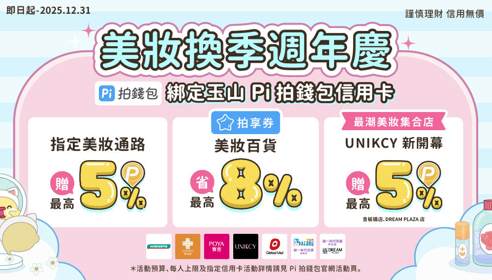 活動三、 Pi 拍錢包綁定玉山 Pi 拍錢包信用卡,至指定美妝通路消費,最高贈5%P幣