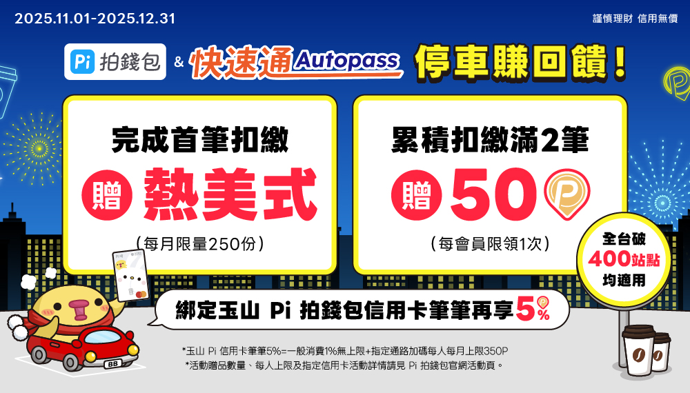 活動期間內,使用 Pi 拍錢包綁定「Autopass 快速通」停車自動扣服務,於「Autopass 快速通」合作停車場成功扣繳2筆停車費(不限金額) 贈50 P幣,每會員限領一次。