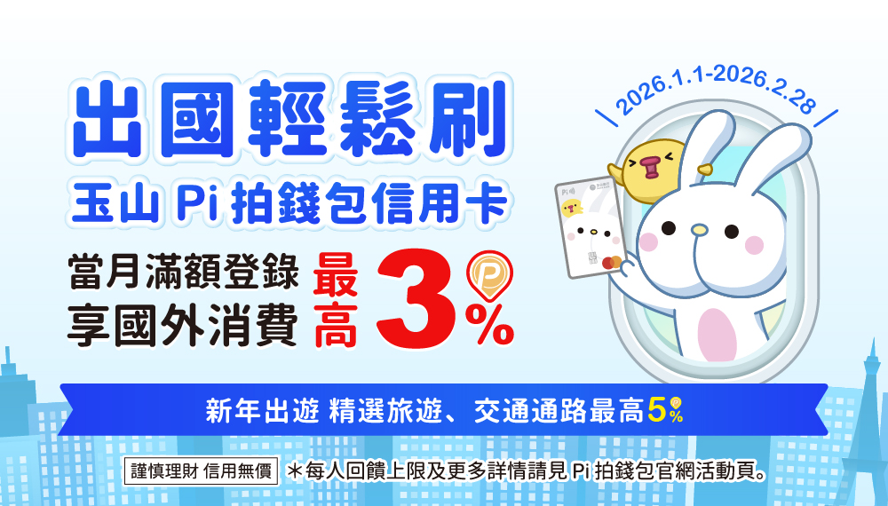 新年出遊趣✈️出國輕鬆刷!玉山 Pi 拍錢包信用卡滿額登錄享國外消費最高3% P幣💰