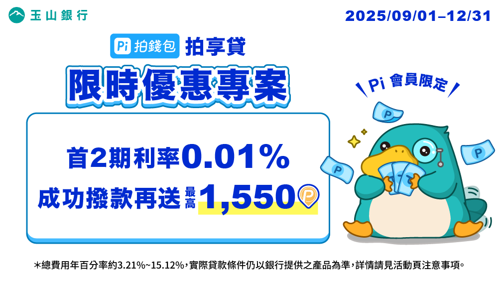 活動期間內,經由本活動頁指定申辦連結申貸玉山銀行指定信用貸款,完成申貸於2026/01/15前成功撥貸,再享 Pi 拍錢包會員限定禮【1,500 P幣】。