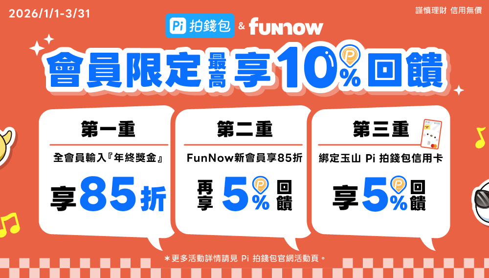 活動期間內,使用 Pi 拍錢包綁定玉山 Pi 拍錢包信用卡於FunNow APP消費再享筆筆最高5% P幣回饋
