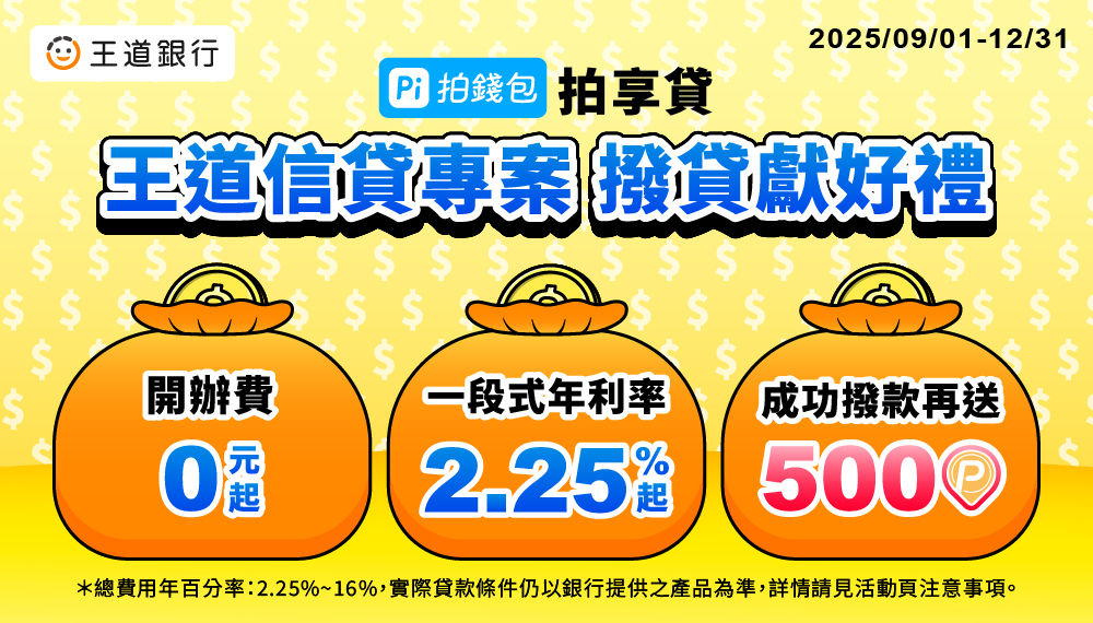 活動期間內,經由本活動頁 Pi 拍錢包指定申辦連結完成申貸王道銀行信用貸款,於2025/12/31前成功撥貸者,送 Pi 拍錢包會員限定禮【500 P幣】。