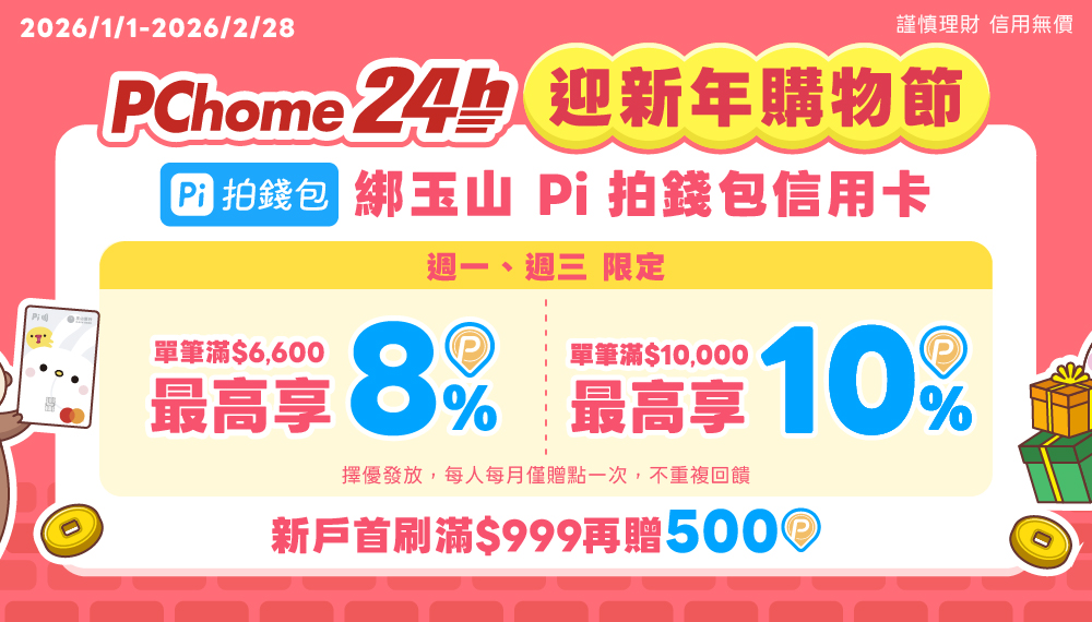 活動期間內於週一、週三,使用 Pi 拍錢包綁定玉山 Pi 拍錢包信用卡於 PChome24H 消費,單筆實付滿6,600元(含)以上享最高8% P幣回饋。