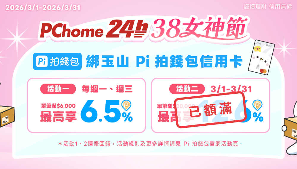 🔥 活動二:2026/3/1-2026/3/31 38女神節單筆實付滿20,000元加碼10%,最高享12.6% P幣回饋(活動二已於3/2 08:00額滿)