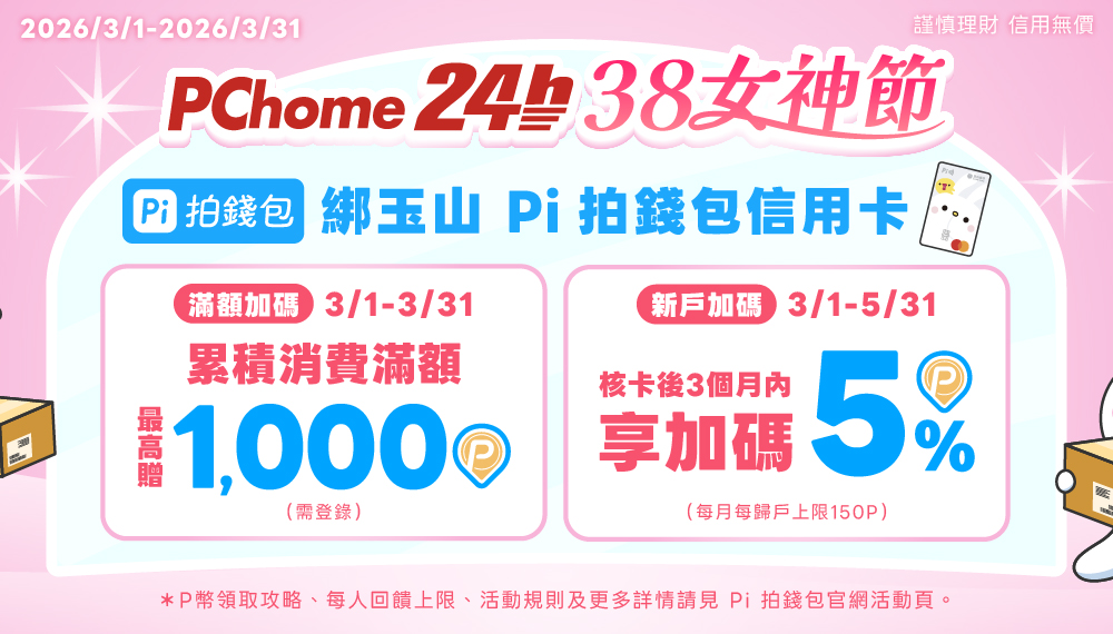 🔥 活動二:2026/3/1-2026/3/31 38女神節單筆實付滿20,000元加碼10%,最高享12.6% P幣回饋 (活動二已於3/2 08:00額滿)