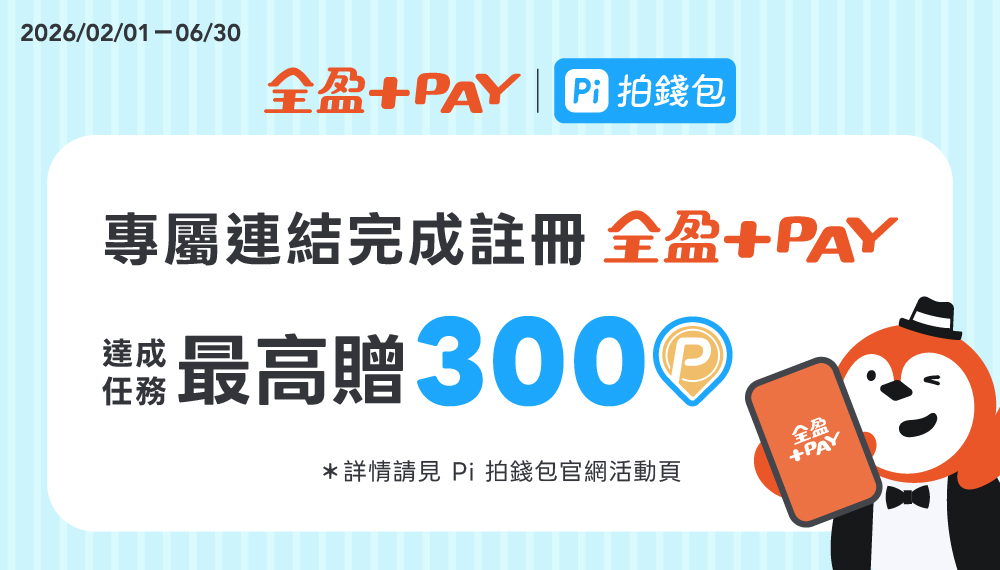 活動期間Pi拍錢包用戶透過指定專屬連結完成註冊全盈+PAY,贈50P幣。