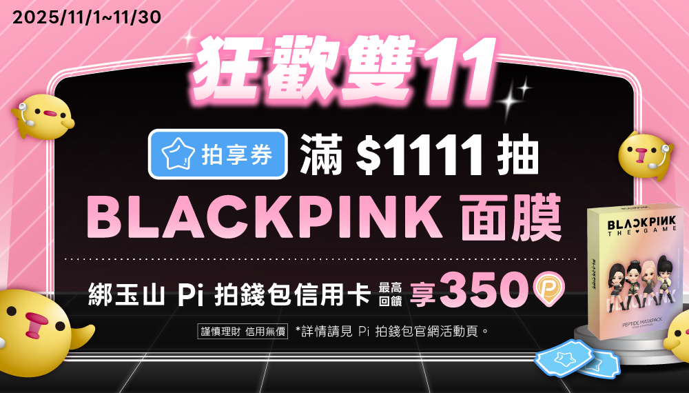 活動期間內,持Pi 拍錢包於Pi APP購買拍享券,累計消費$1,111即獲得抽BLACKPINK面膜乙次。