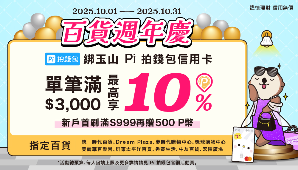 活動期間,持 Pi 拍錢包綁定玉山 Pi 拍錢包信用卡於指定百貨消費,單筆實付滿$3,000元享最高10% P幣回饋。