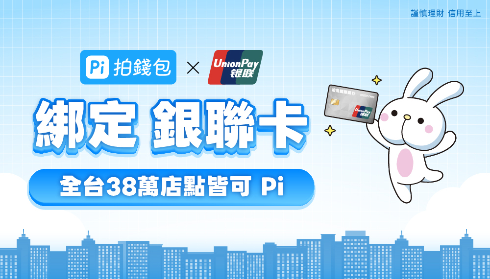 即日起,凡臺灣籍用戶於指定銀行申辦之銀聯卡,可於 Pi 拍錢包綁定銀聯卡,在全台38萬店點輕鬆Pi、立即付。
